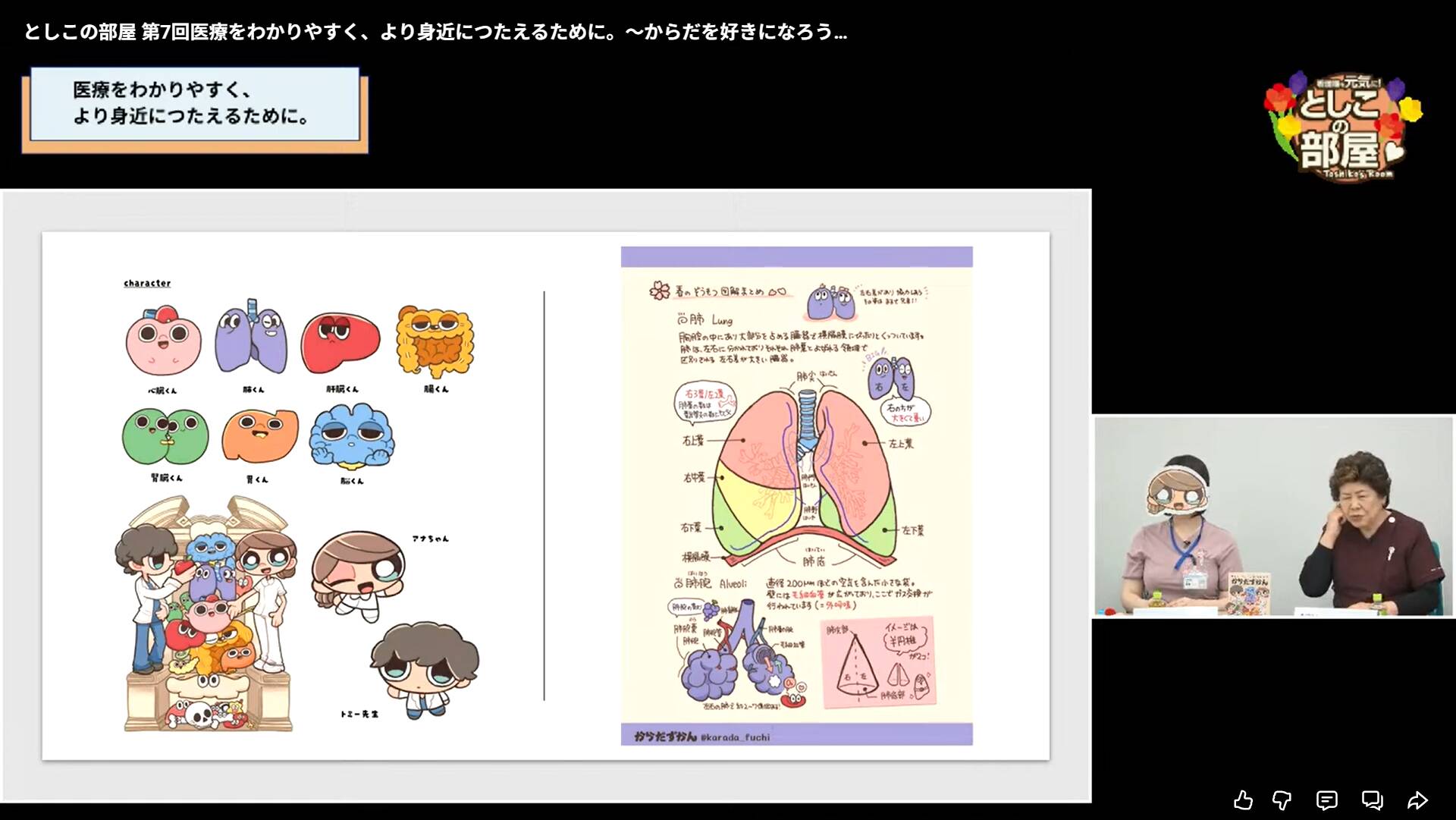 第7回の生配信では、現役看護師ながらイラストレーターとして活躍されている角野ふちさんが登場。臓器や感情をイラスト化して、医療をわかりやすく、より身近に感じるコンテンツを制作されています。角野さんが描くイラストは、個性的なモチーフの中に温かみのあるキャラクターばかり。「医療をもっと身近に、体を好きになってほしい」という想いで、SNSで発信されているそうです。