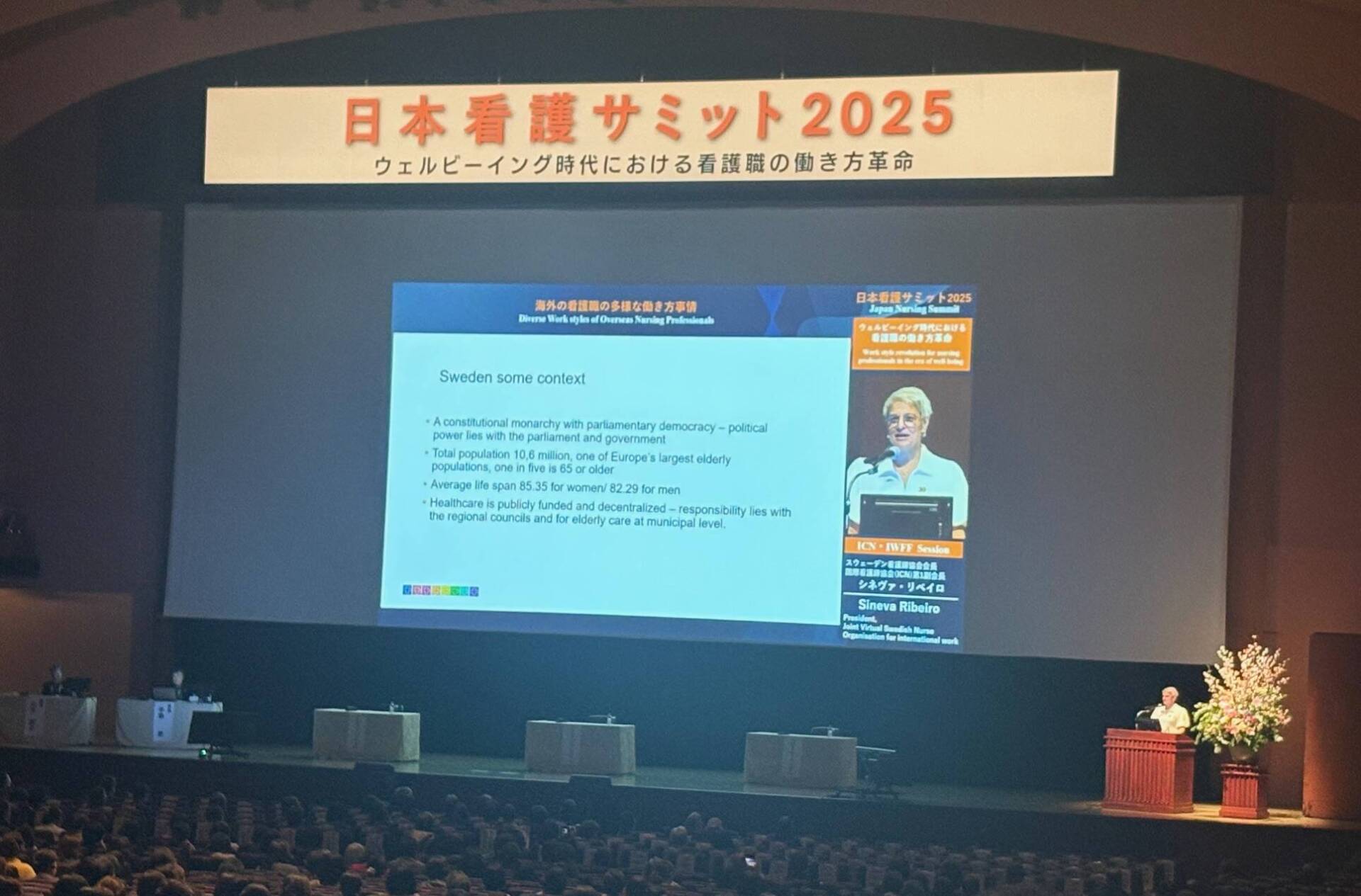 ▲スウェーデンの看護職事情を語るスウェーデン看護師協会会長・国際看護師協会(ICN)第1副会長 シネヴァ・リベイロ氏。当日は同時翻訳機が一人1台配布されました