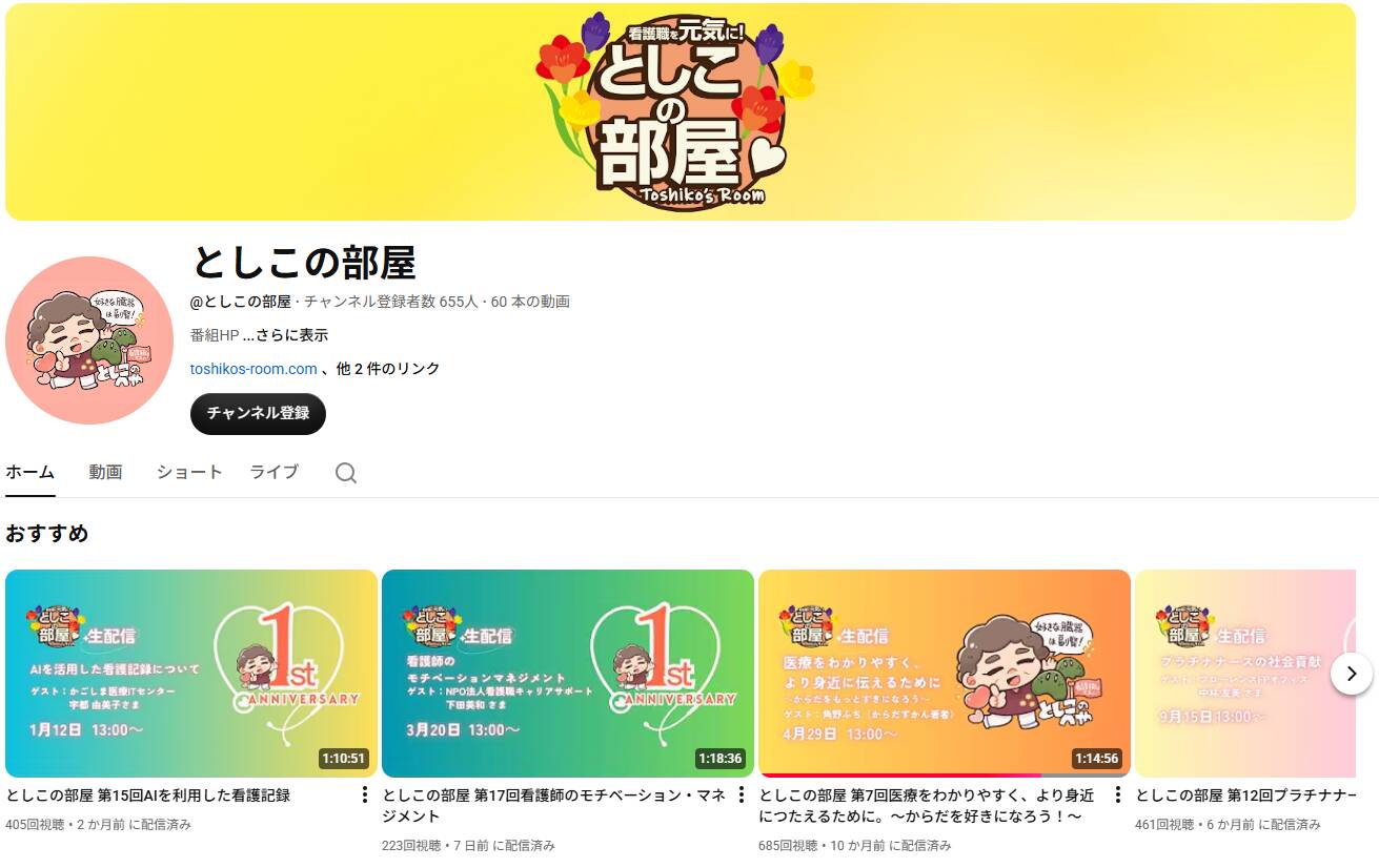 2024年には、「看護師をもっと応援したい」という思いから、YouTuberデビューを果たしました。私のチャンネル「としこの部屋」では、ユニークな取り組みをしている看護師を毎月紹介しています。手術中の深部静脈血栓症を防ぐための包帯巻き具を手作りして特許を取った看護師長、野球好きの若者を看護補助者として育てながら看護学校に進学させている看護部長等。これからも看護の現場でキラリと光る宝物を探していきますので、皆さんもユニークな取り組みや明るい職場の情報をぜひお寄せください。