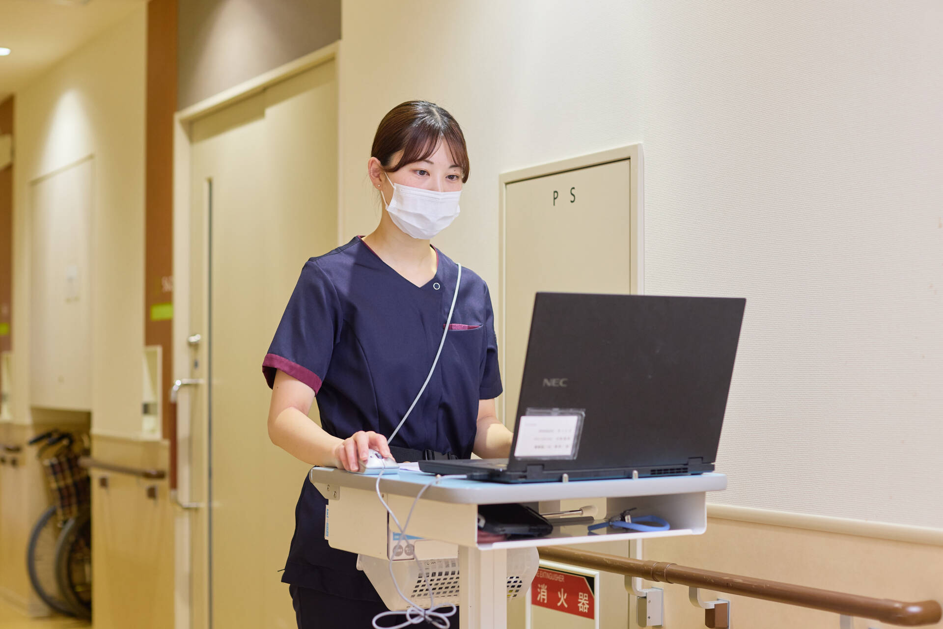 ▲適時入力を推進するために導入した、専用のPCカート。PCだけではなく、グローブや手指消毒剤、ごみ箱など、ケアに必要な荷物も持ち運べるように、ワゴン型のタイプに再改良している